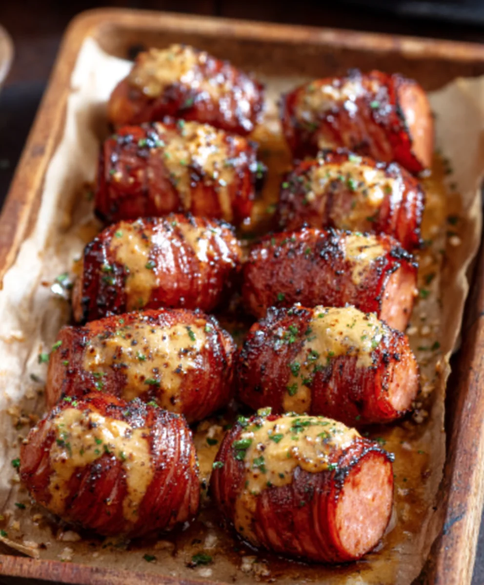 Spicy Mustard Hasselback Beef Sausage Bites