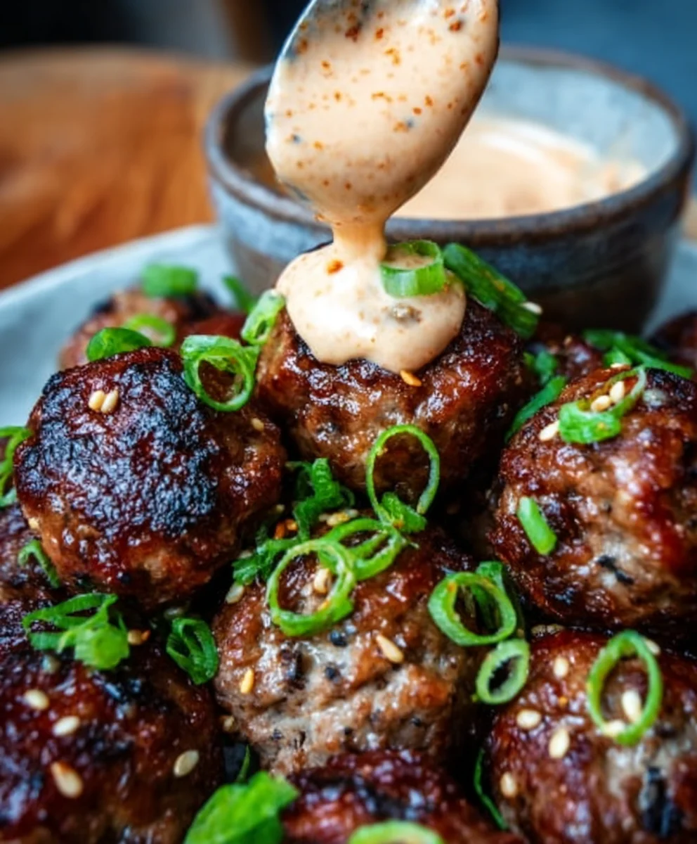 Korean BBQ Beef Meatballs Spicy Mayo Dip